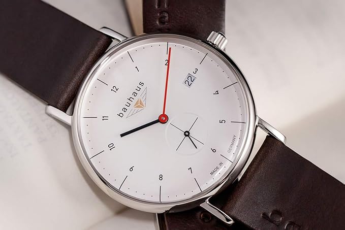 Die Bauhaus 2130-1 steht für klassische Eleganz, klare Linien und zuverlässige Präzision. Mit ihrem weißen Ziffernblatt, dem hochwertigen Edelstahl-Gehäuse und dem braunen Lederarmband verkörpert diese Herrenuhr einen zeitlosen Stil, der sich vielseitig kombinieren lässt.