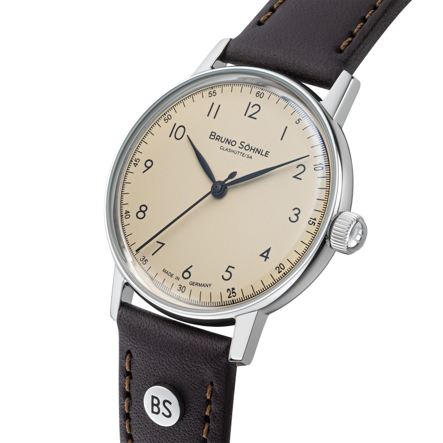 Das cremefarbene Zifferblatt mit schwarzen arabischen Ziffern verleiht der Uhr eine helle, freundliche Ausstrahlung. Klassisch-elegant und gleichzeitig modern wirkt die Kombination mit dem dunkelbraunen Echtlederband, das durch seine weiche Haptik und schlichte Verarbeitung höchste Tragequalität bietet.