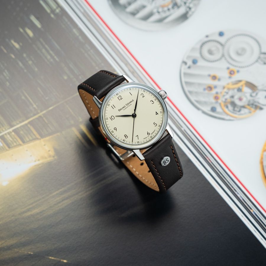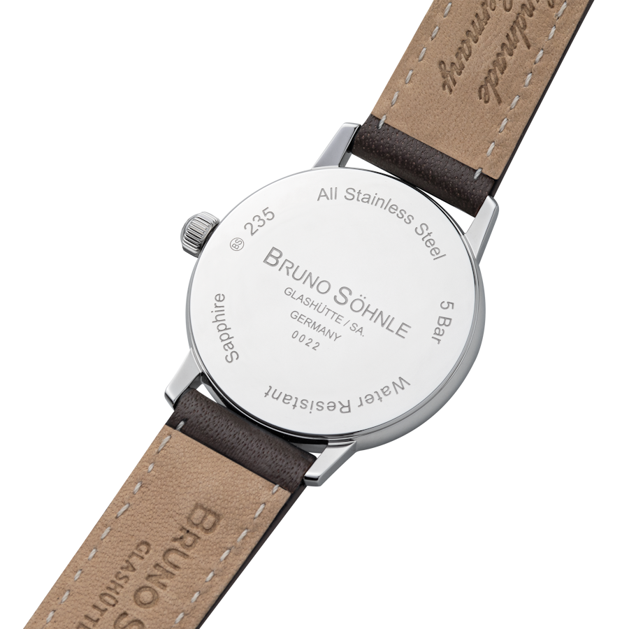 Quarzwerk in veredelter Bruno Söhnle-Ausführung (Basiswerk Ronda 1063), Edelstahl, Ø 32 mm, Höhe 6,7 mm, Bandanstoß zu Bandanstoß 37,4 mm, 5 bar, gewölbtes Saphirglas innen entspiegelt, Echtlederband dunkelbraun mit Ziernaht Ton in Ton, Bandverlauf 16/14 mm, Dornschließe