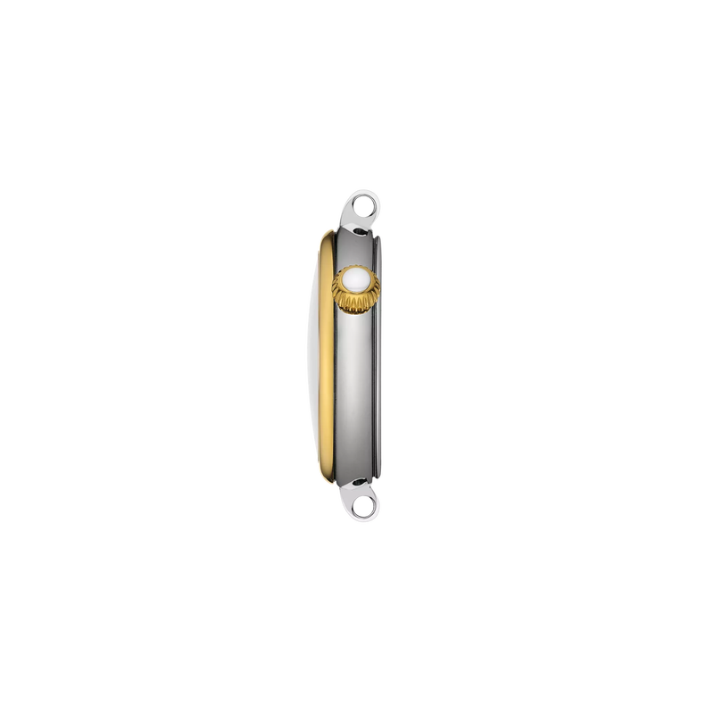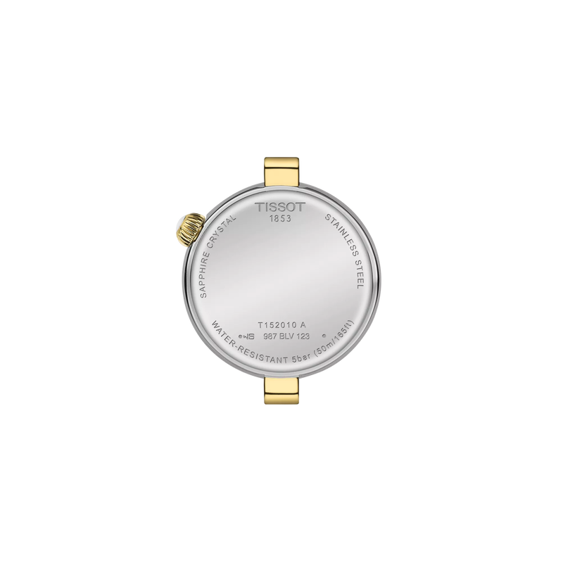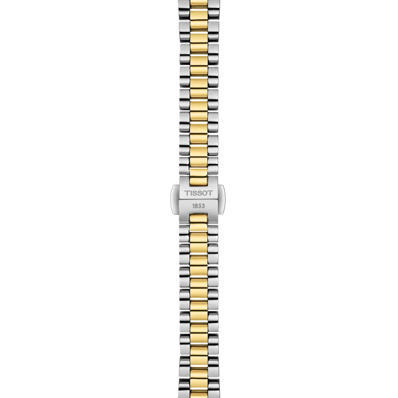 Diese Ausführung der Tissot Desir besitzt ein 28 mm messendes 316L-Edelstahlgehäuse in Bicolor mit gelbgoldfarbener PVD-Beschichtung. Ihr weißes Perlmuttzifferblatt verfügt über einen silberfarben glitzernden äußeren Rand sowie römische Ziffern. Auf der bei 2 Uhr an der Gehäuseflanke positionierten, gelbgoldfarbenen Krone sitzt ein weißer Cabochon. Das ebenso massive wie flexible 316L-Edelstahlarmband – ebenfalls in Bicolor mit gelbgoldfarbener PVD-Beschichtung – verfügt über eine Butterfly-Faltschließe mit Drückern und hält die Uhr sicher am Handgelenk.