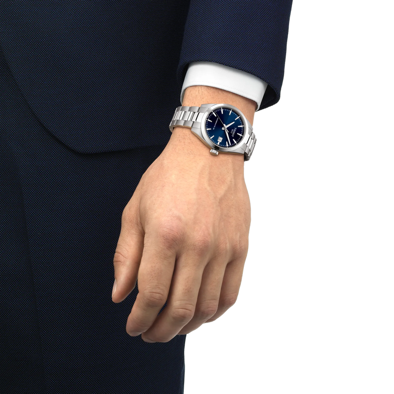 Entdecken Sie diese schicke Variante der Tissot Gentleman 38mm mit blauem Zifferblatt und teils poliertem, teils gebürstetem 316L-Edelstahlarmband mit Butterfly-Faltschließe mit Drückern. Dank des benutzerfreundlichen Schnellwechselsystems lässt sich das Armband einfach und werkzeuglos gegen andere passende Modelle austauschen.