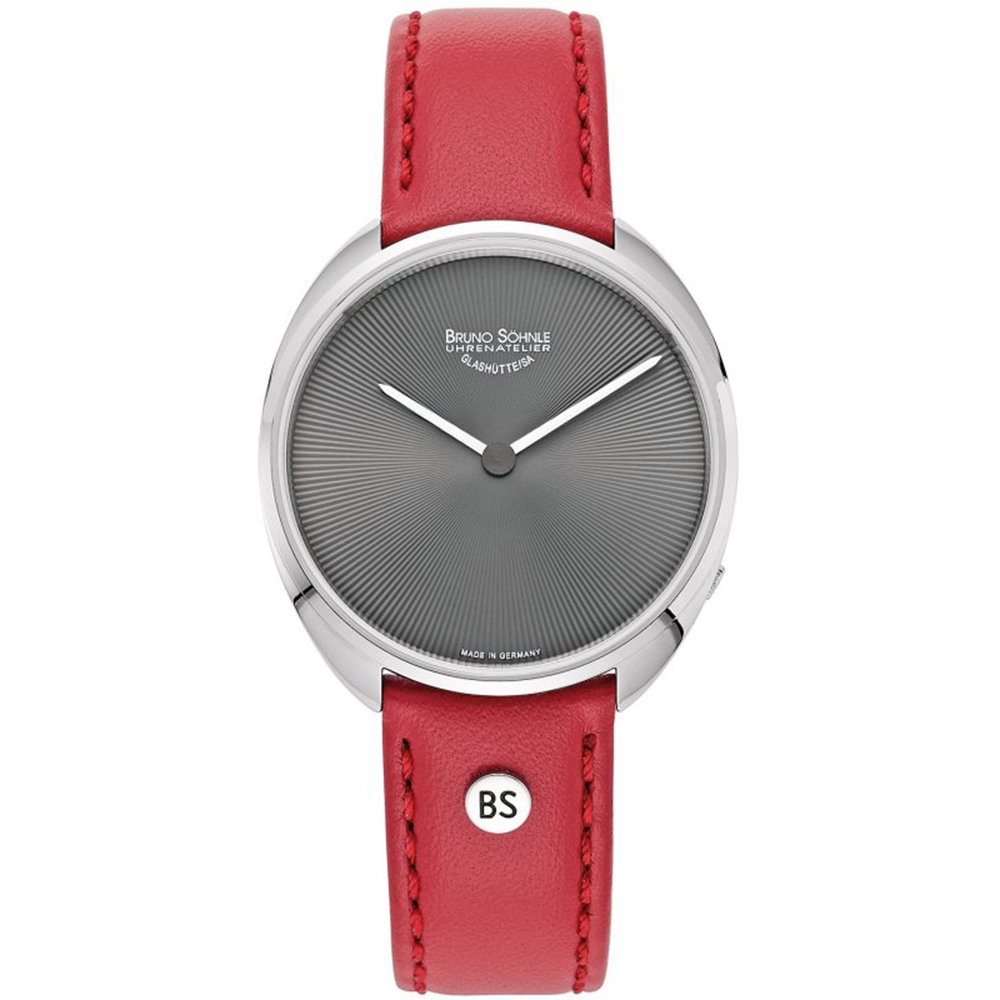 Quarzwerk in veredelter Bruno Söhnle-Ausführung (Basiswerk Ronda 762), Edelstahl, Ø 37,0 mm, Höhe 6,3 mm, 3 bar, Saphirglas innen entspiegelt, Kalbsleder rot, Dornschließe