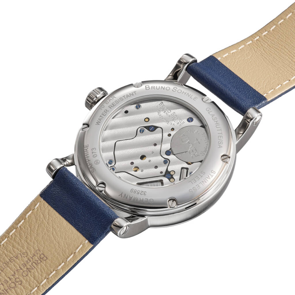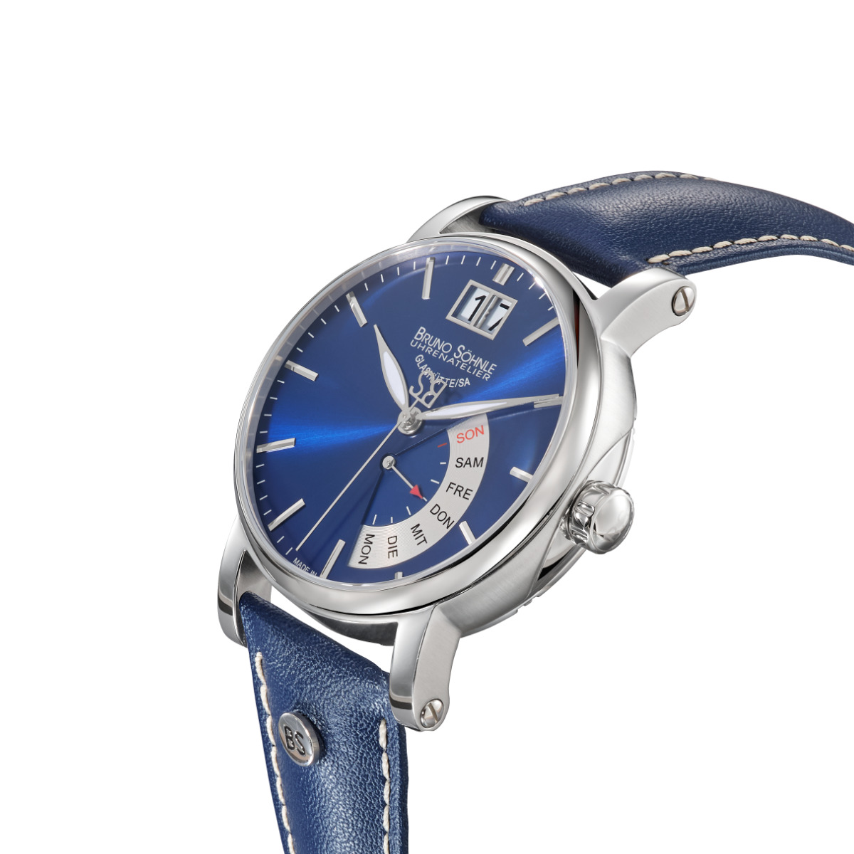 Bruno Söhnle Pesaro I (17-13073-341) Herrenuhr Bruno Söhnle Pesaro I (17-13073-341) Herrenuhr. Edelstahl, schweizer Quarzwerk Cal. Ronda 7003.L, retrograde Wochentagsanzeige, Datum, entspiegeltes Saphirglas. 10 ATM getestet, Durchmesser 43 mm, Höhe 13,65 mm, blaues Kalbslederband mit Faltschließe, 2 Jahre Herstellergarantie. Bruno Söhnle Uhren verleihen durch ihre technische Vollkommenheit und besondere Ästhetik eine neue Dimension und sind gleichzeitig absolut präzise. Das in Glashütte veredelte Quarzwerk Ronda aus der Schweiz ist das Herzstück der Uhren. Bei Uhrenliebhabern sorgt auch die Automatikuhren-Kollektion für Aufsehen. Die Marke Bruno Söhnle verbindet in der Uhrmacherkunst seit über einem halben Jahrhundert Funktionalität und Schönheit. Zudem stehen die Bruno Söhnle Uhren für geprüfte deutsche Qualität. Die Bruno Söhnle Uhren zeichnen feine Armbanduhren aus, mit angenehm zu tragenden Armbändern, gediegenen Gehäusen und hochwertigen Uhrwerken – eine Qualität in Präzision. Der Verkauf und die Lieferung erfolgt inklusive der original Box und Garantieschein.