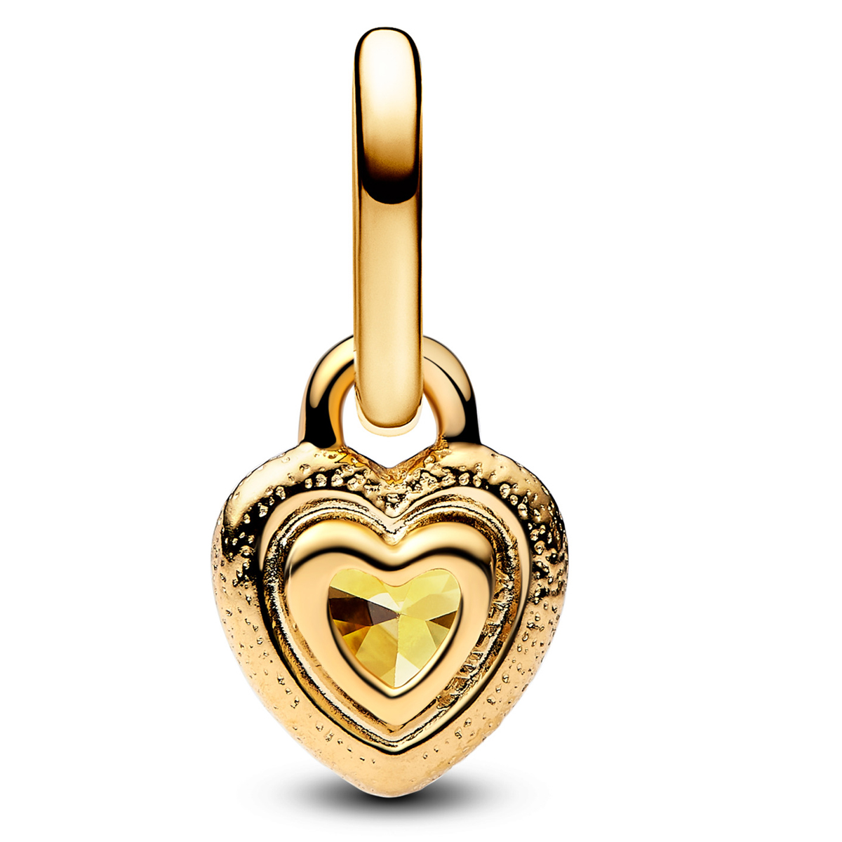 Feiere deine Lieben mit einem wunderschönen herzförmigen Charm, das von einem strukturierten Metallrahmen umgeben ist und den Effekt eines schlagenden Herzens erzeugt.