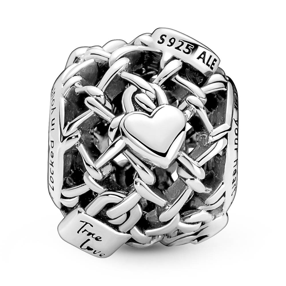 Sind neue Charms der Schlüssel zu Deinem Herzen? Schließe Dein neues Styling mit diesem Offen gearbeitetes Kettenglieder Vorhängeschloss Charm auf. Das Charm ist aus Sterling-Silber mit einem Ausstanz-Muster von Hand veredelt und hat kleine Vorhängeschloss-Motive, inspiriert von den Liebesschlössern, die von Paaren auf Brücken der ganzen Welt angebracht wurden. Es trägt die Gravuren Locked in your heart, True love und Love you.