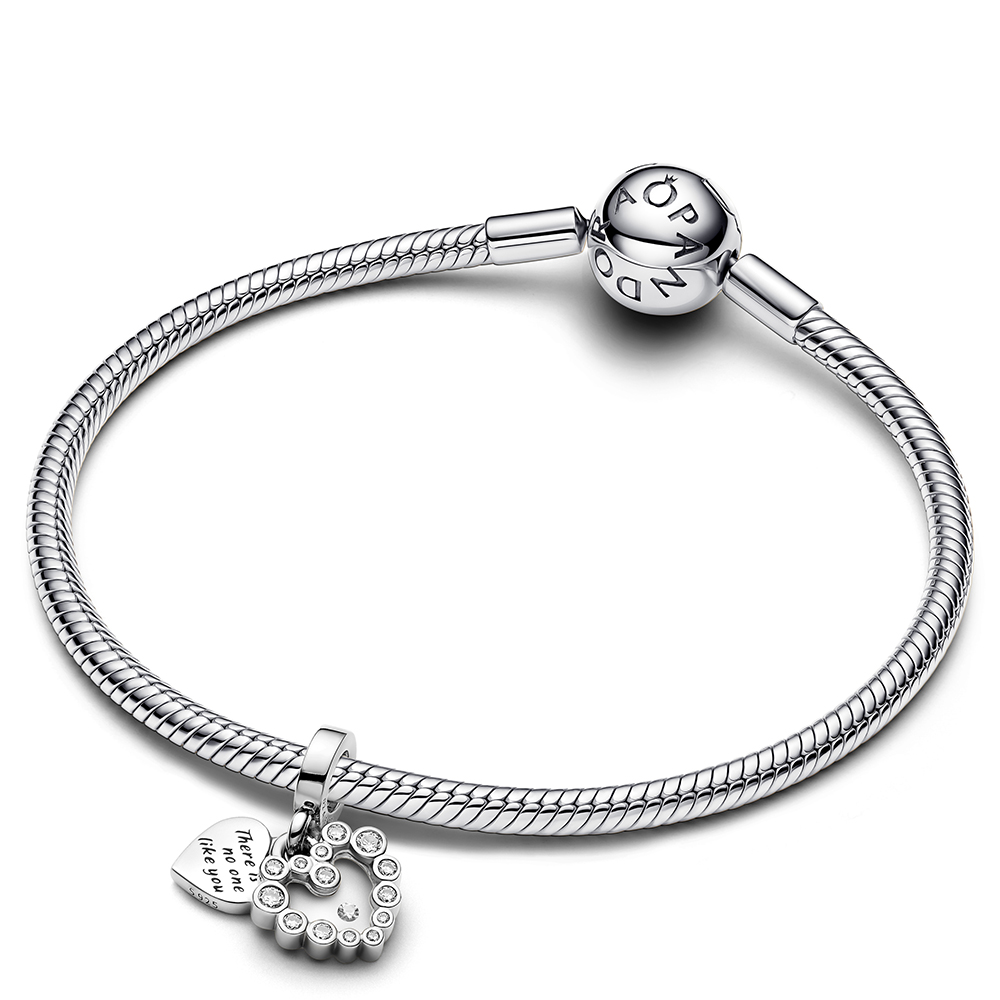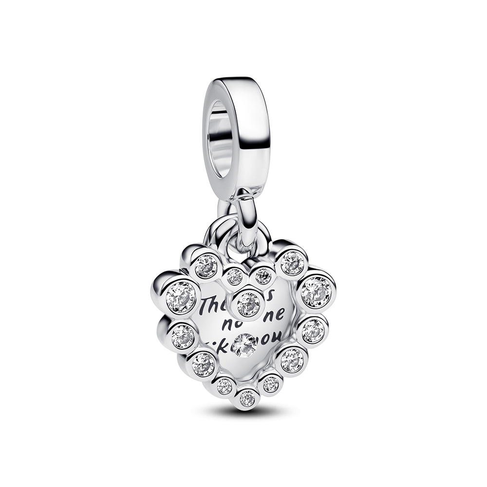 Zeige deine Gefühle mit dem Funkelnden Doppel-Herzanhänger. Dieses Sterling-Silber Charm besteht aus zwei separaten herzförmigen Anhängern. Funkelnde Steine bilden einen Rahmen um den vorderen Anhänger, ein schwebender Stein in der Mitte ist in transparentes Harz gesetzt. Der hintere Anhänger trägt die Aufschrift „There is no one like you.“ Dieses Charm ist von der Mutterschaft in all ihren Facetten inspiriert und feiert die Kraft und Liebe einer Mutter.