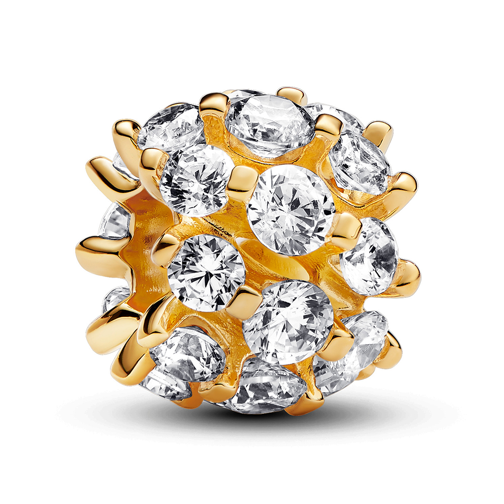 Ergänze dein Stacking mit dem Funkelndes Rundes Charm, einem vergoldeten Pandora Moments Schmuckstück. Das auffällige Motiv des Charms zeigt ein raffiniertes, abgerundetes Design, das rundherum von funkelnden Steinen akzentuiert wird, die in auffällige Krappen gefasst sind. Die Steine sind in Reihen angeordnet, wobei jede Reihe drei Steine umfasst, um mehr Strahlkraft zu erzeugen. Perfekt, um deiner vorhandenen Kollektion einen Hauch von Glanz zu verleihen oder um sie einem Glitzer-Fan zu schenken.