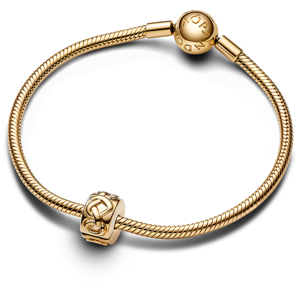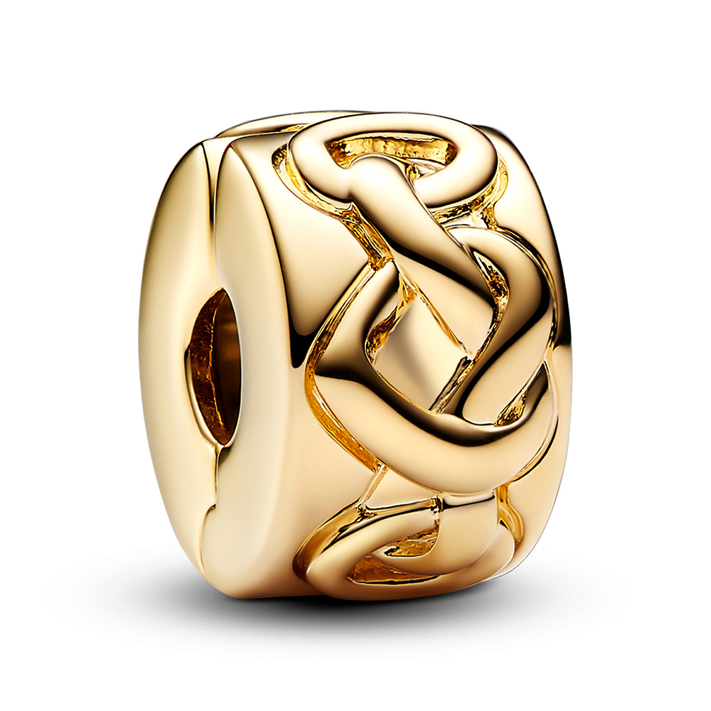 Unser schlichter und doch eindrucksvoller Pandora Moments Clip ist mit einer Reihe aus verknoteten Herzen verziert. Das Design besteht aus einer Kombination aus symbolträchtigen Herzen und dem klassischen Liebesknoten, der dem Schmuckstück einen emotionalen Ausdruck verleiht. Das vergoldete Charm ist die perfekte Wahl, um deiner Armband-Sammlung einen liebevollen Look zu verleihen und gleichzeitig deine Charms gleichmäßig zu platzieren. Der Clip besitzt keinen Silikonkern und muss auf festen Gewinden sitzen, damit er nicht verrutscht.
