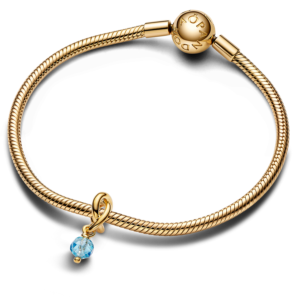 Trage ein Symbol der Ewigkeit, das deine Persönlichkeit zum Ausdruck bringt. Dieser vergoldete Charm-Anhänger besteht aus einem dreifach geknoteten Kreis, der wie ein Unendlichkeitszeichen verschlungen ist. Der Knoten trägt einen facettierten aquablauen künstlichen Kristall, der vom Charm herabhängt. Trage ihn als farbenfrohen Akzent an deinem Trägerschmuckstück oder verschenke ihn an eine Person, die immer Teil deines Lebens sein soll.
