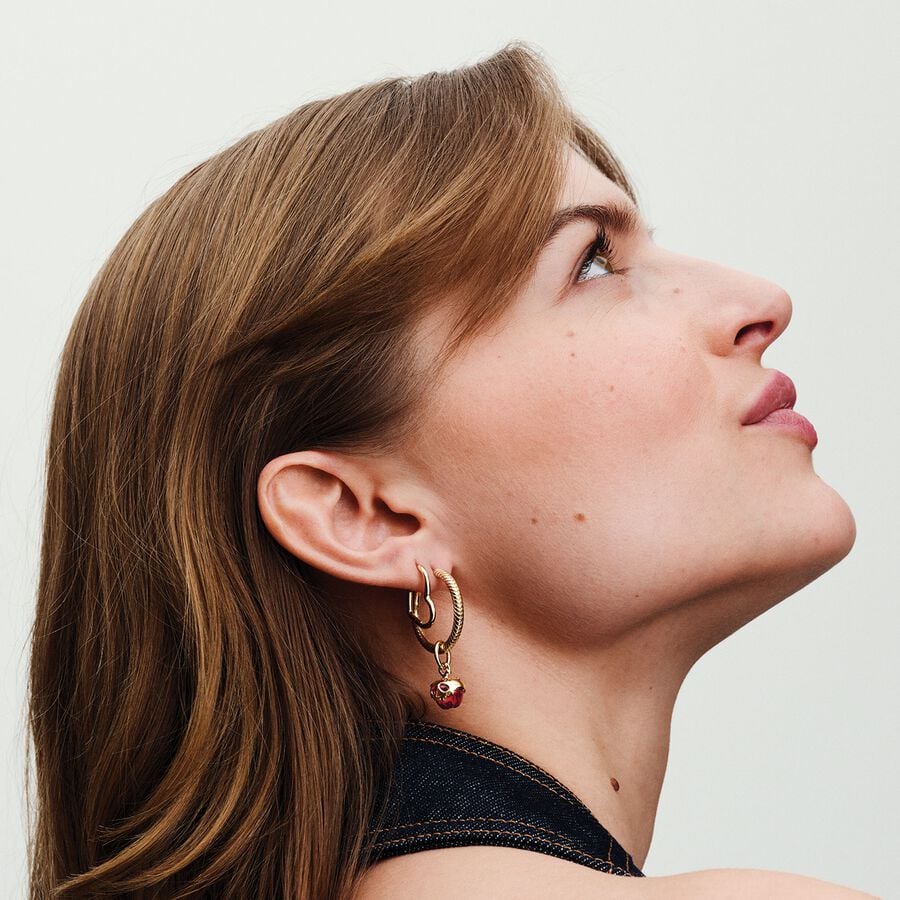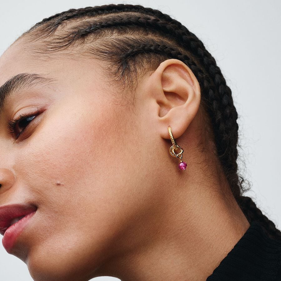 Trage ein Symbol der Ewigkeit, das deine Persönlichkeit zum Ausdruck bringt. Dieser vergoldete Charm-Anhänger besteht aus einem dreifach geknoteten Kreis, der wie ein Unendlichkeitszeichen verschlungen ist. Der Knoten trägt einen facettierten, phloxrosafarbenen künstlichen Kristall, der vom Charm herabhängt. Trage ihn als farbenfrohen Akzent an deinem Trägerschmuckstück oder verschenke ihn an eine Person, die immer Teil deines Lebens sein soll.