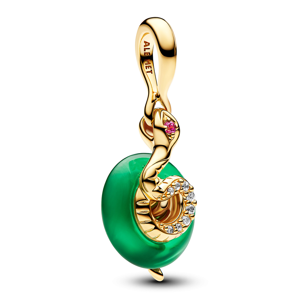 Feiere das neue Mondjahr mit unserem Grüner Murano-Glas Schlange Charm-Anhänger. Eine vergoldete gemusterte Schlange mit funkelnden Steinen ruht auf einem Kreis aus tiefgrünem Murano-Glas. Dieses Schmuckstück symbolisiert Intelligenz und Verwandlung und ist die perfekte Art, das Jahr der Schlange zu begrüßen.