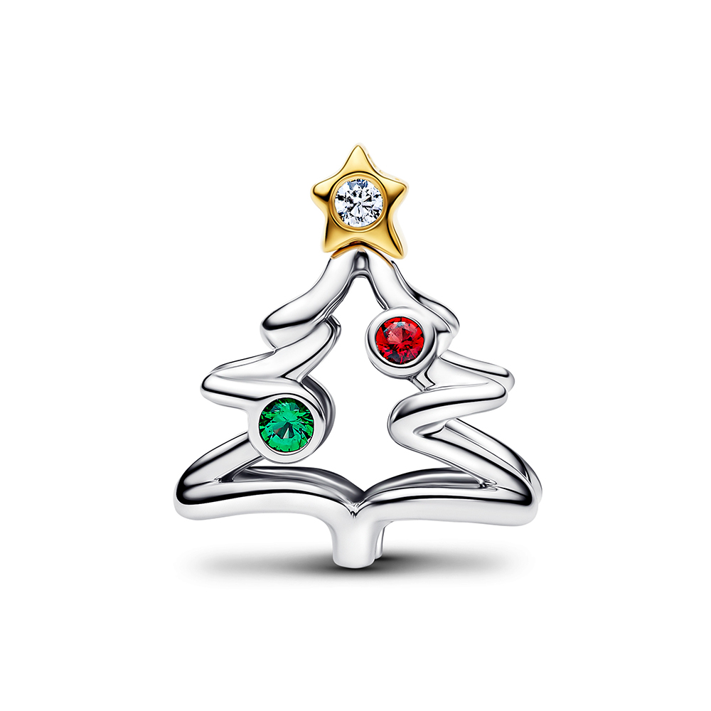 Ein Weihnachtsklassiker, neu interpretiert. Dieses offen gearbeitete Weihnachtsbaum Charm verbindet Sterling-Silber und 14 Karat Vergoldung mit leuchtend roten und grünen künstlichen Kristallen und einer Sternspitze. Perfekt, um deinen Weihnachtslook aufzupeppen.