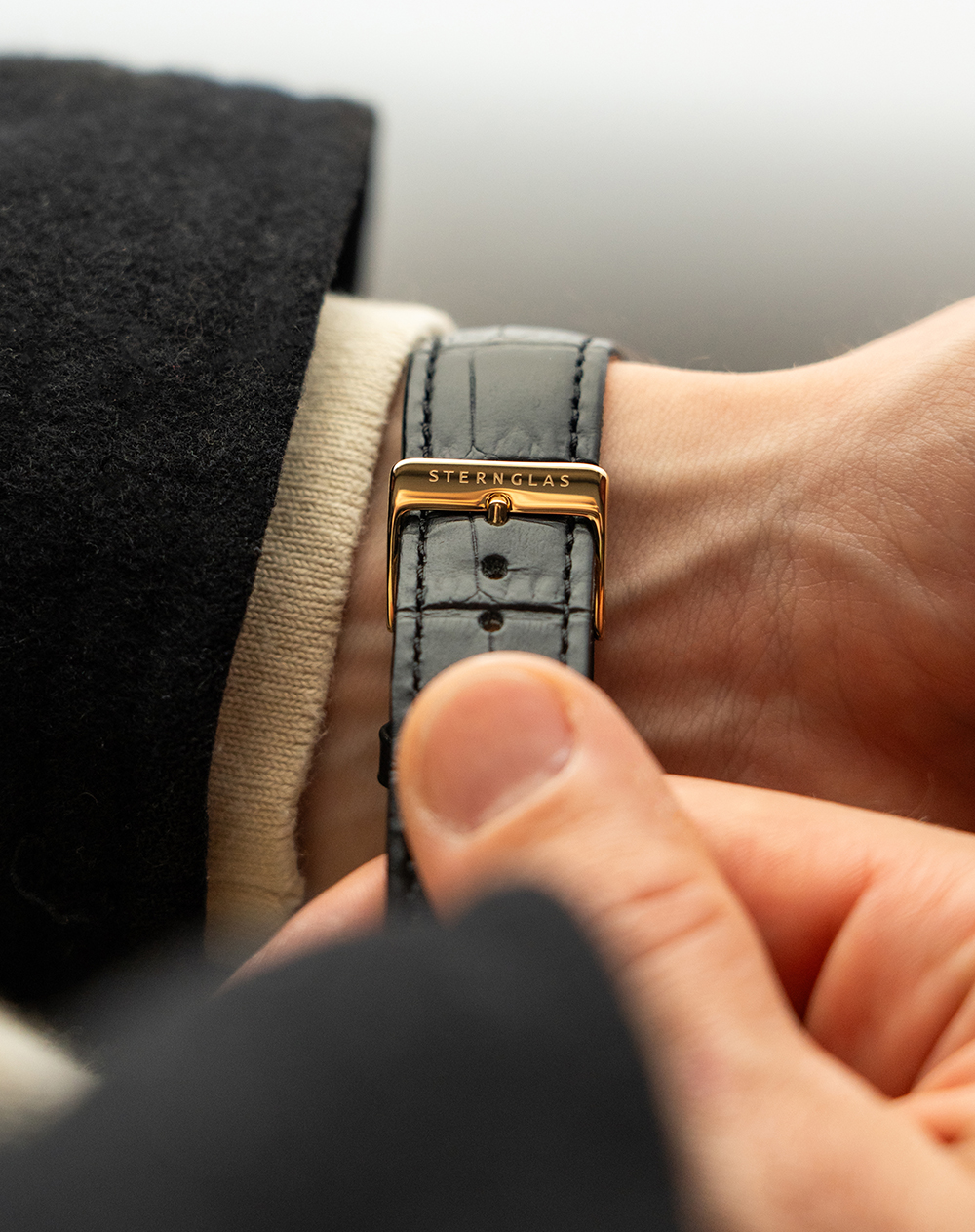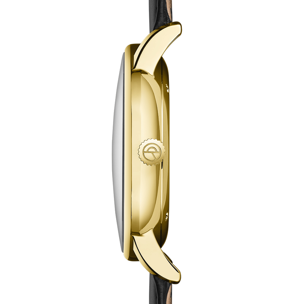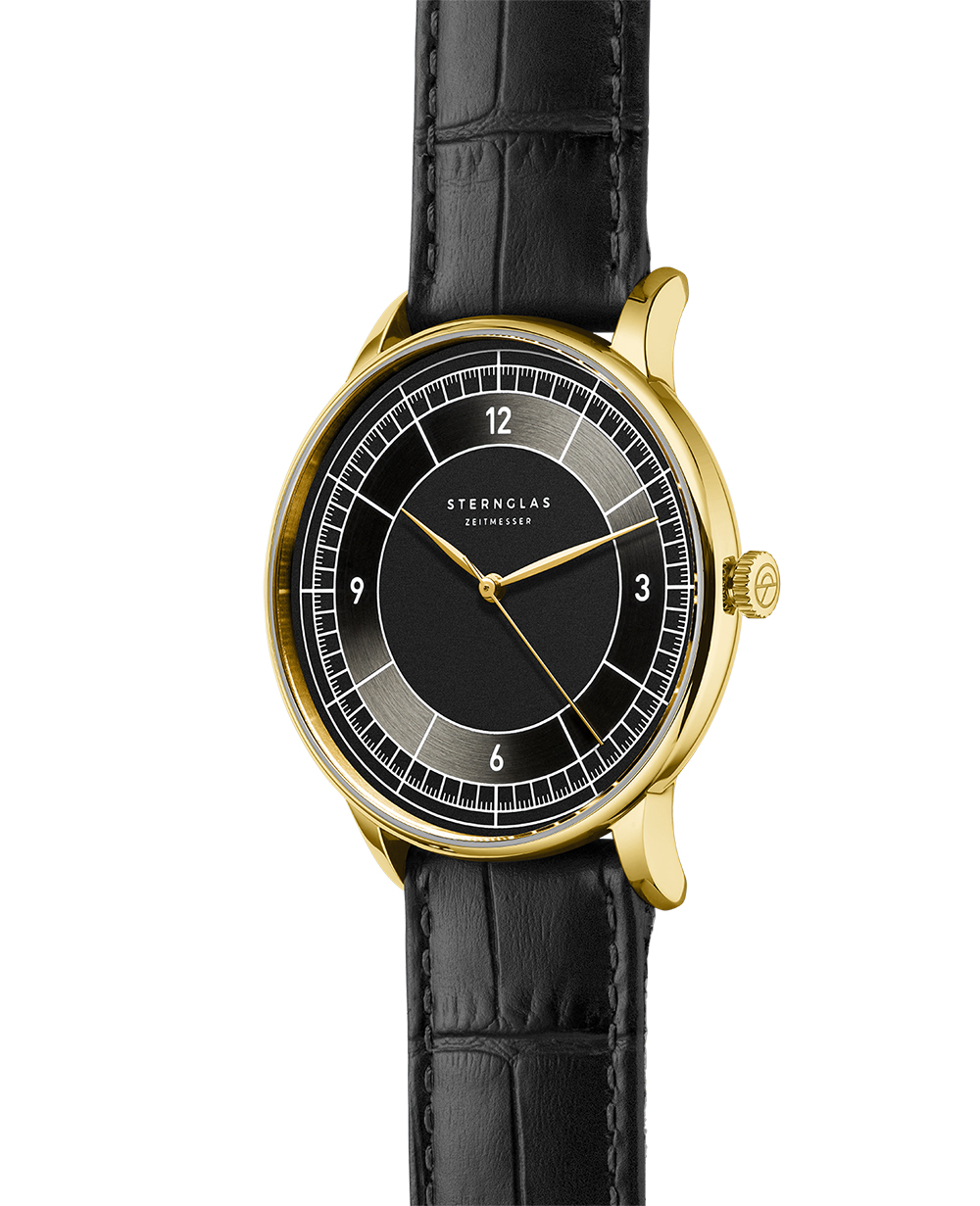 Das 40 mm Gehäuse aus robustem, poliertem 316L Edelstahl umschließt ein satiniertes, weiß-silberenes Zifferblatt mit Rundschliff. Die neuen Blattzeiger in gold und die Tag/Nacht-Gravur auf dem Gehäuseboden bilden einen schönen Kontrast und spielen dabei mit der Verbindung von Bauhaus und Art Déco.