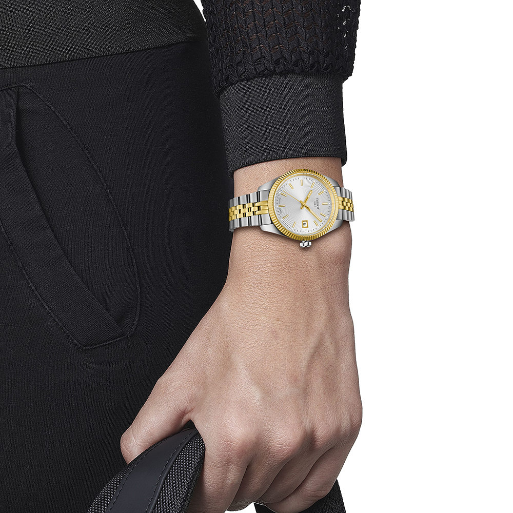 Diese Ausführung der Tissot Ballade 34mm besitzt ein 34 mm messendes 316L-Edelstahlgehäuse in Bicolor mit gelbgoldfarbener PVD-Beschichtung. Kratzfestes, entspiegeltes Saphirglas liegt schützend über dem silberfarbenen Zifferblatt, das über eine Datumsanzeige bei 3 Uhr verfügt. Gelbgoldfarbene Zeiger und Indizes heben sich dezent vom Zifferblatt ab, und ihre SuperLuminova® Leuchtbeschichtung gewährt beste Ablesbarkeit.