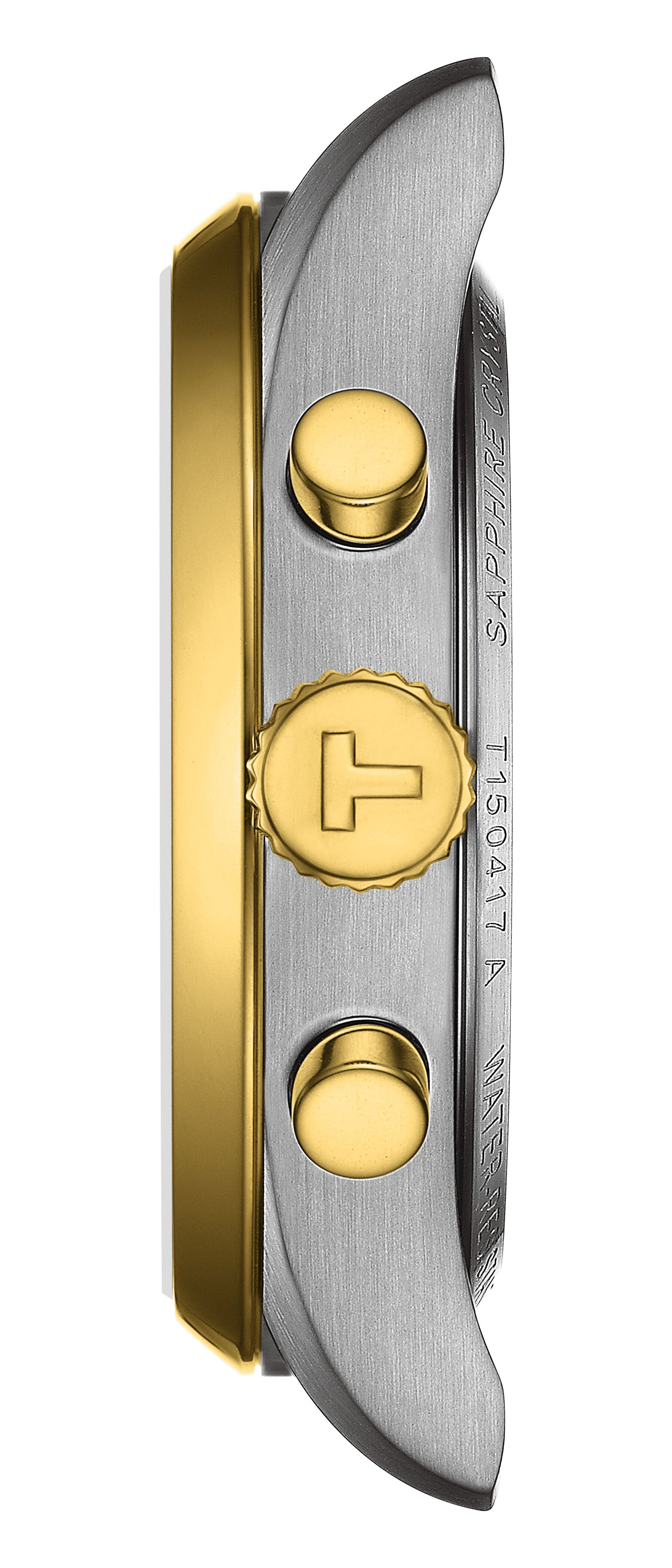 Dieses Tissot PR 100 Chronograph Modell verfügt über ein 40 Millimeter messendes 316L-Edelstahlgehäuse mit PVD-Beschichtung in Gelbgold-Bicolor und ein präzises Swiss Made Quarzwerk mit Endanzeige der Batterielebensdauer. Sein silberfarbenes Zifferblatt mit Stabindizes und Datumsanzeige liegt gut geschützt unter kratzfestem Saphirglas. Totalisatoren, also Hilfszifferblätter, bei 2, 6 und 11 Uhr zeigen Zehntelsekunden, Sekunden bzw. 30 Minuten an. Das ebenso massive wie flexible 316L-Edelstahlarmband, ebenfalls mit PVD-Beschichtung in Gelbgold-Bicolor versehen, erlaubt dank Schnellwechselsystem einen einfachen, werkzeuglosen Austausch. Es verfügt über eine Butterfly-Faltschließe mit Drückern.