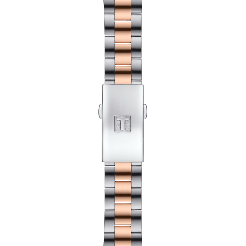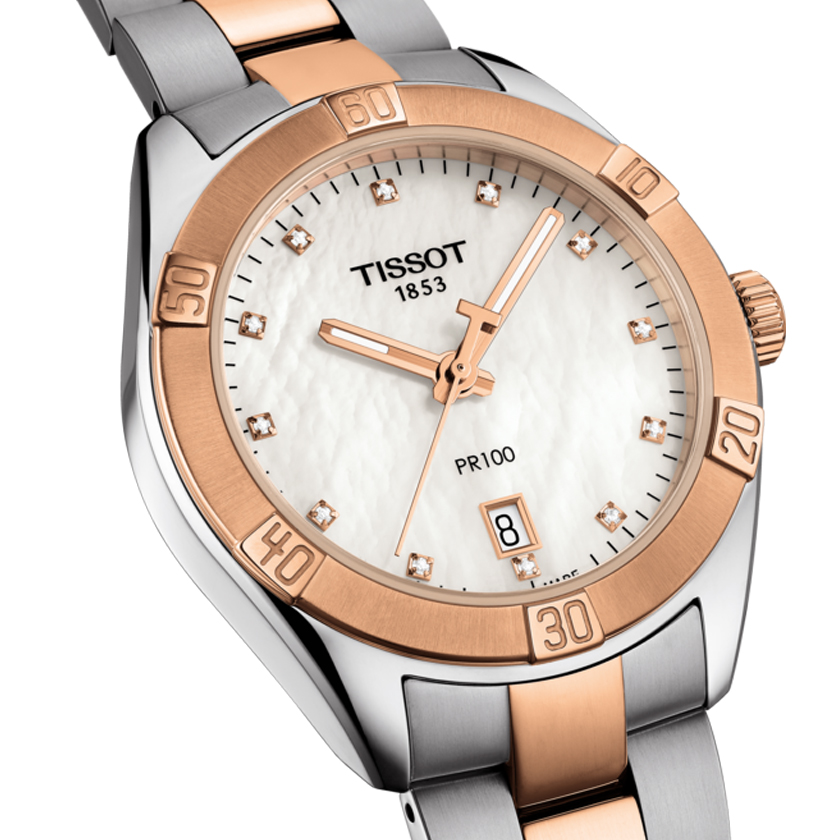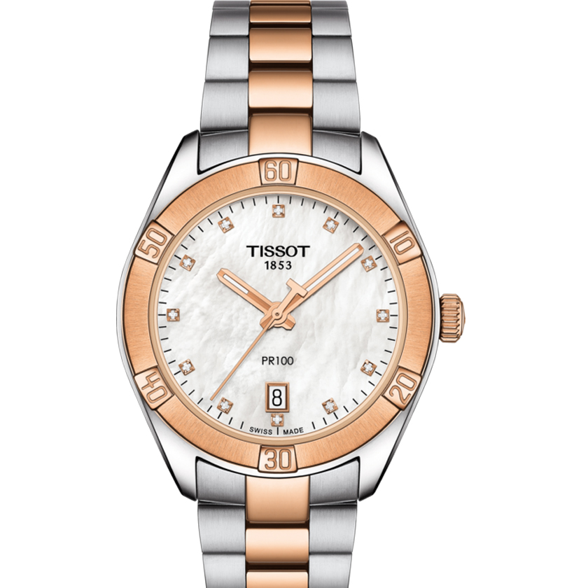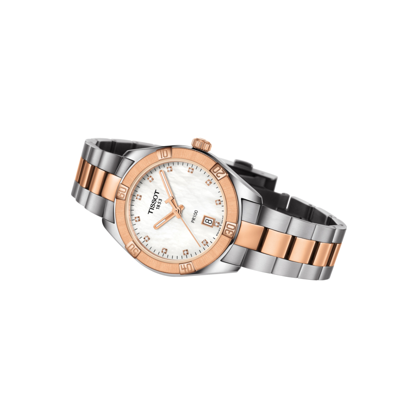 Die zeitlose Tissot PR Kollektion wurde um die Tissot PR 100 Sport Chic erweitert. Die PR 100 Kollektion ist in vielen verschiedenen Ausführungen zu haben und dies ist einer der Gründe, warum dieses Modell so beliebt ist. Zu den Merkmalen dieser sportlichen Ausführung gehört ein Swiss Made Quartzwerk mit Batterie-Endanzeige, ein kratzfestes Saphirglas und eine Datumsanzeige. Dieses Damenmodell aus der Tissot PR 100 Kollektion hat ein Bicolor 316L-Edelstahlgehäuse mit rosegoldfarbener PVD-Beschichtung und ein weißes Perlmutt Zifferblatt mit Diamanten als Indizes. Die Zeiger sind mit Superluminova beschichtet. Das schöne Bicolor 316L-Edelstahlarmband mit rosegoldfarbener PVD-Beschichtung hat eine Faltschließe mit Drückern.