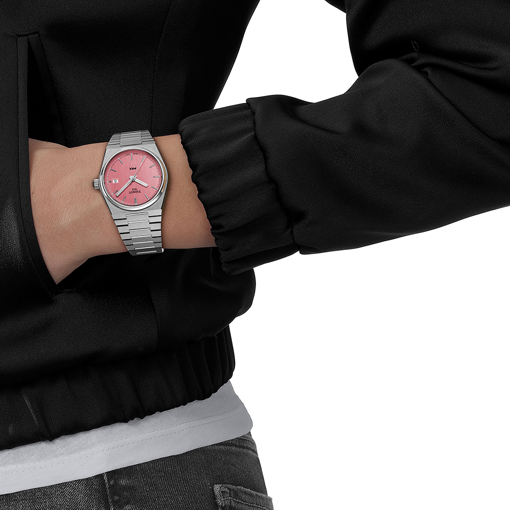 Dieses PRX 35mm Modell verfügt über ein 316L-Edelstahlgehäuse, ein pinkes Zifferblatt mit Datumsanzeige und mit SuperLuminova Leuchtmasse beschichtete Stabzeiger sowie Indexe. Das integrierte 316L-Edelstahlarmband besitzt ein Schnellwechselsystem und eine Butterfly-Faltschließe mit Drückern.