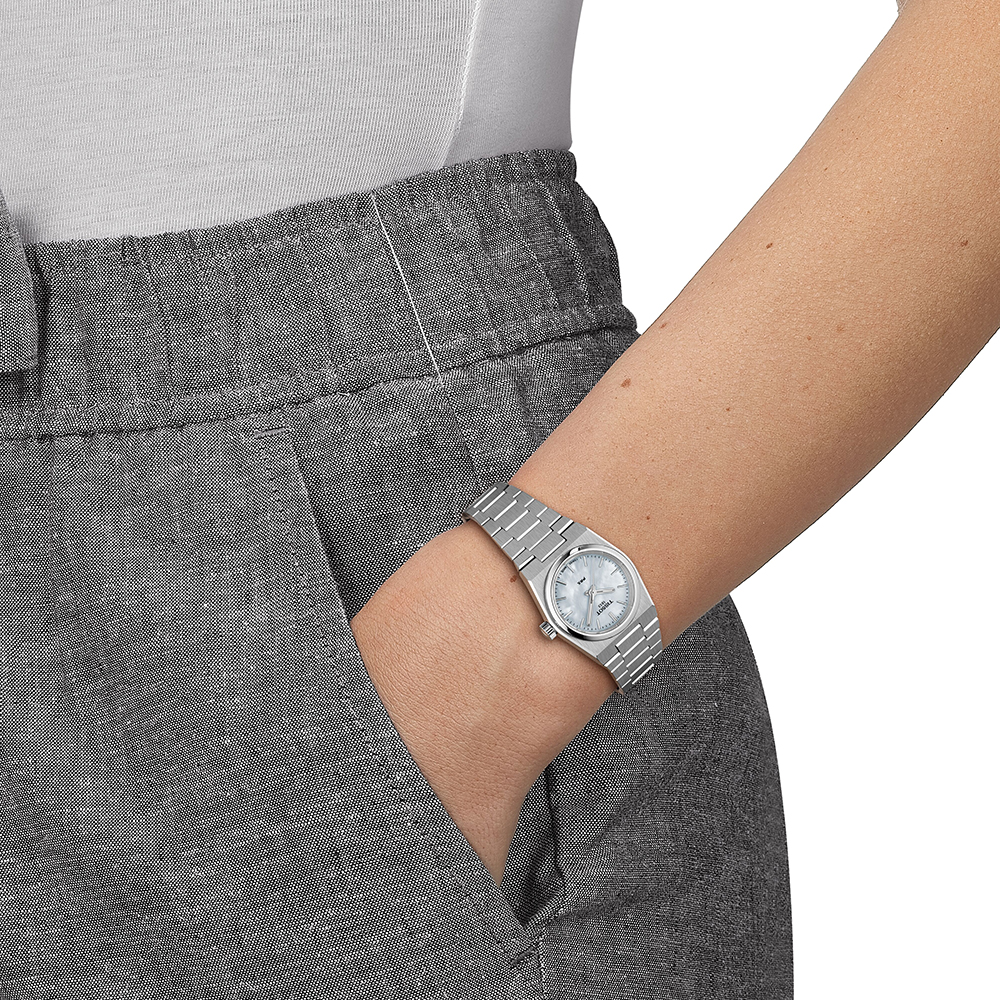 Diese PRX 25mm Ausführung besitzt ein weißes Perlmuttzifferblatt. Das ebenso massive wie flexible 316L-Edelstahlarmband mit Butterfly-Faltschließe mit Drückern hält die Uhr sicher am Handgelenk.