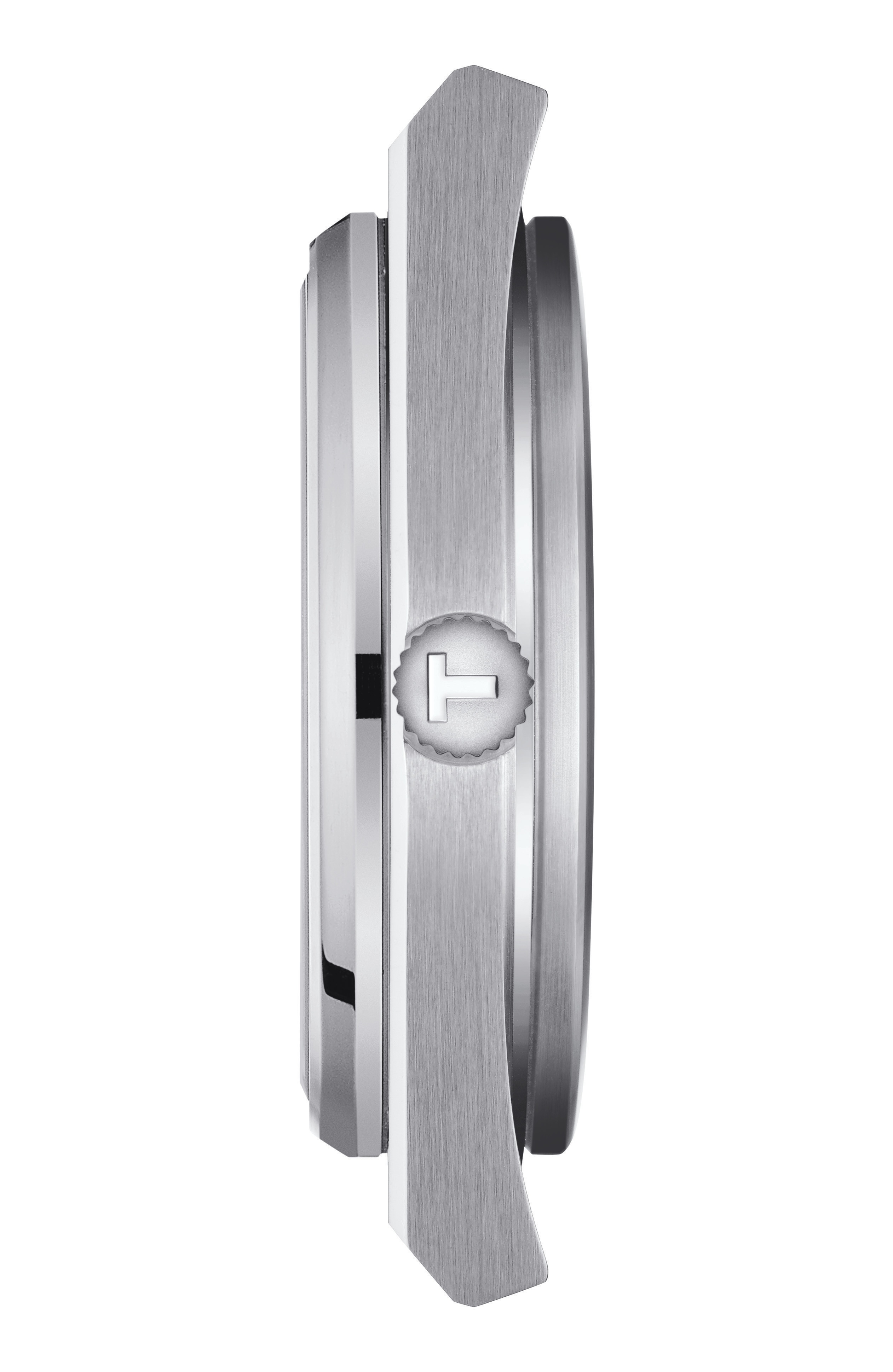 Das 316L-Edelstahlgehäuse der Tissot PRX hat einen Durchmesser von 40 mm. Es weist eine leichte Tonneau-Form auf und wird von einer schmalen, runden Lünette geziert. An den Seiten wechseln sich vertikal gebürstete, abgerundete Finishes mit polierten Facetten ab.
