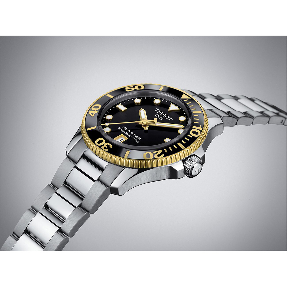Sie fühlen es. Unter den Wellen herrscht Stille. Im kristallklaren Wasser sehen Sie die durch die Wasseroberfläche brechenden Sonnenstrahlen. In Ihrem Inneren: nichts als Ruhe. An Ihrem Handgelenk: die Tissot Seastar 1000 Quartz, Ihre Tür zur Unterwasserwelt. Mit 36 mm Durchmesser schafft die Seastar 1000 Quartz Vertrauen. Sie ist schick, vielseitig und für Tauchgänge in die Tiefen des Ozeans ebenso gemacht wie für den Großstadtdschungel.
