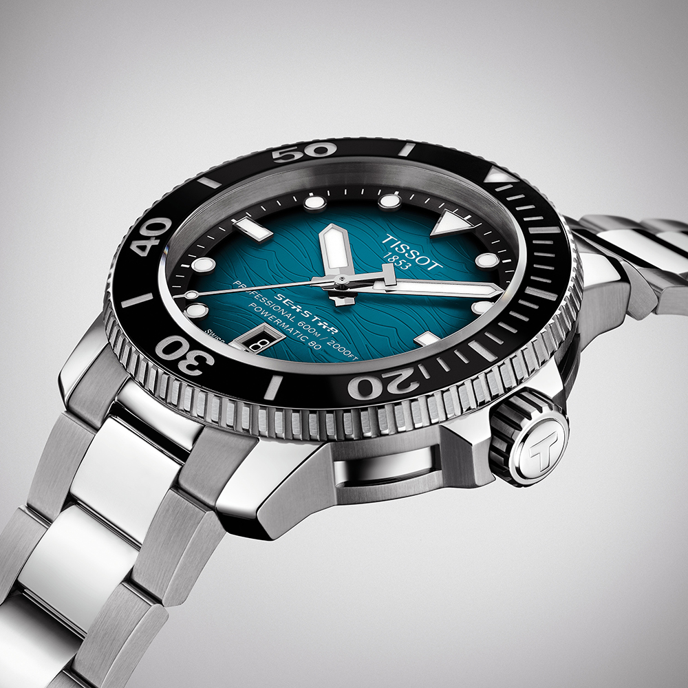 Dieses Tissot Seastar 2000 Professional Powermatic 80 Modell verfügt über ein Zifferblatt mit Farbverlauf von Türkis nach Schwarz sowie graviertem Wellenmotiv, über eine Taucherlünette mit schwarzer Keramik-Einlage und ein massives 316L-Edelstahlarmband mit Sicherheitsfaltschließe und Drückern.