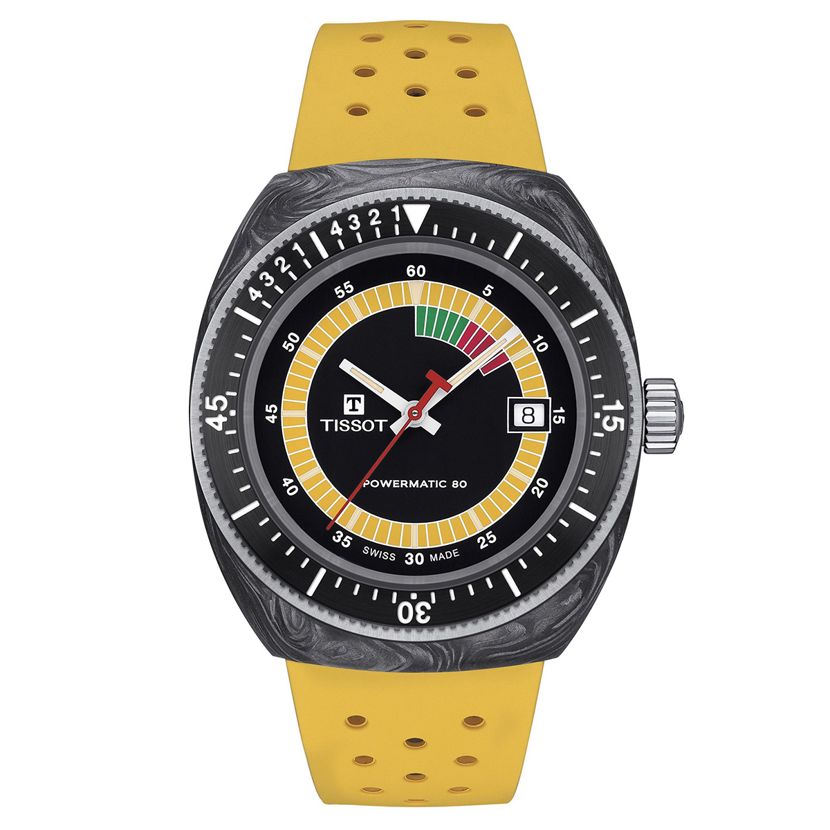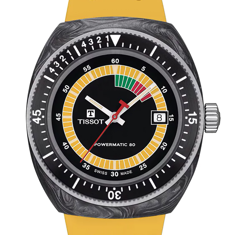 Und hier ist Sie wieder: Tissot Sideral, mit modernster Technik, in markanten Farben, mit farbenfrohen Armbändern, die im Handumdrehen selber ausgetauscht werden können. Das Gehäuse besteht aus hochwertigem Edelstahl und geschmiedetem Carbon, mit einseitig drehbarer Lünette, farbenfrohe Zifferblätter, unterschiedlich leuchtende Stunden- und Minuten-Markierungen, ein Nivachron-Automatikuhrwerk mit einer Gangreserve von bis zu 80 Stunden - all dies bringt eine dynamische Ästhetik mit einem unvergleichlichen Retro-Charm ans Handgelenk. Mit einer Wasserdichte von 30 bar setzt diese Herrenuhr sowohl unter als auch über Wasser ein bahnbrechendes Statement.