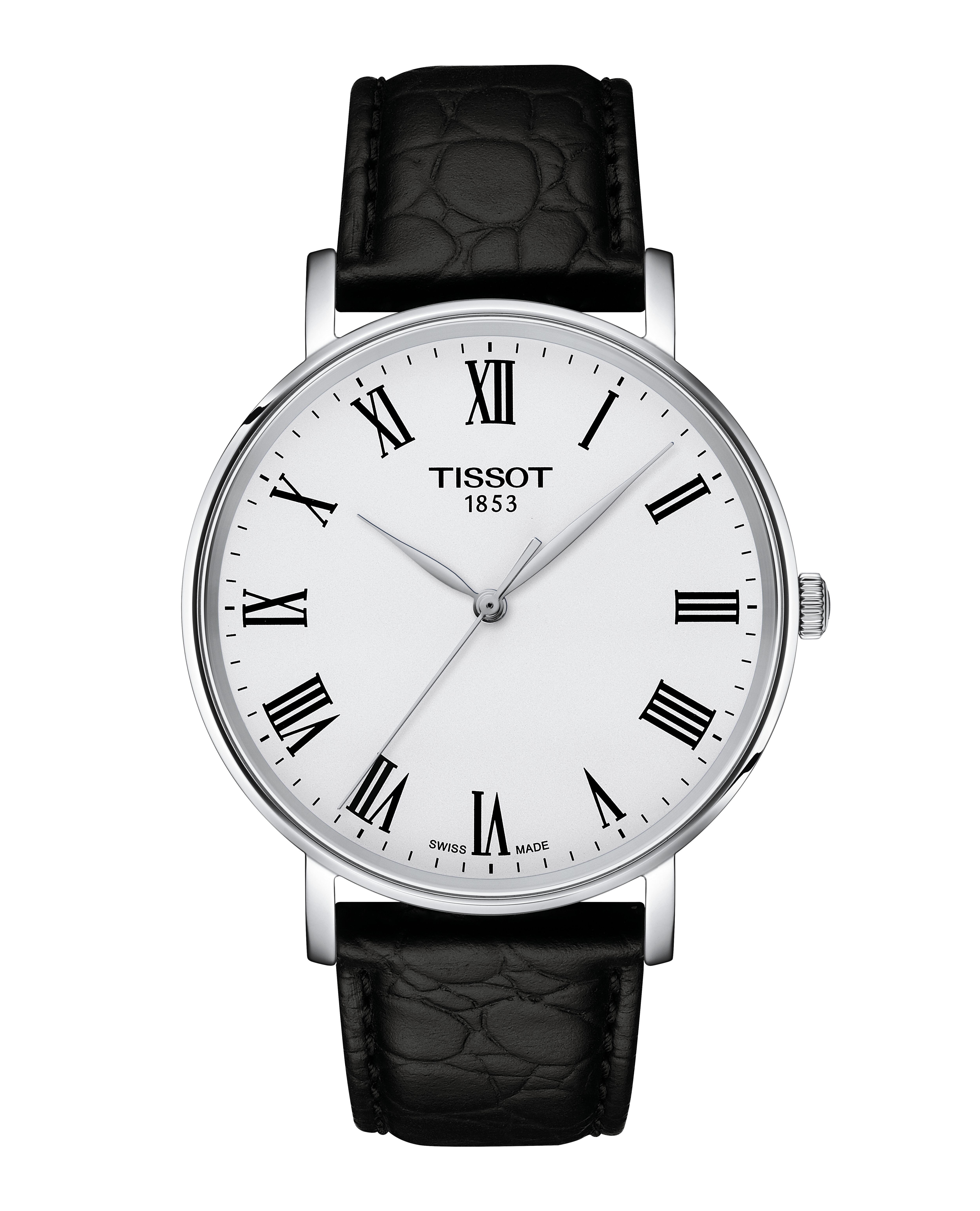 Dieses Tissot Everytime 40mm Modell besitzt ein weißes Zifferblatt mit römischen Ziffern sowie ein schwarzes Lederarmband mit Schnellwechselsystem und Dornschließe.