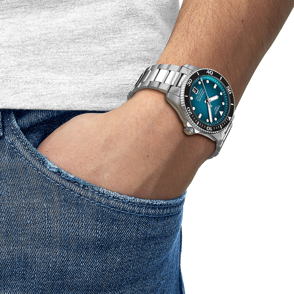 Dieses Tissot Seastar 1000 Powermatic 80 40mm Modell besitzt einen schwarzen Mineralglas-Lünettenring und ein Zifferblatt mit türkisblauem Farbverlauf. Sein Mineralglas-Sichtboden gibt den Blick auf das Powermatic 80 Uhrwerk frei. Das ebenso massive wie flexible 316L-Edelstahlarmband mit Schnellwechselsystem und Sicherheitsfaltschließe mit Drückern hält die Uhr elegant und sicher am Handgelenk.