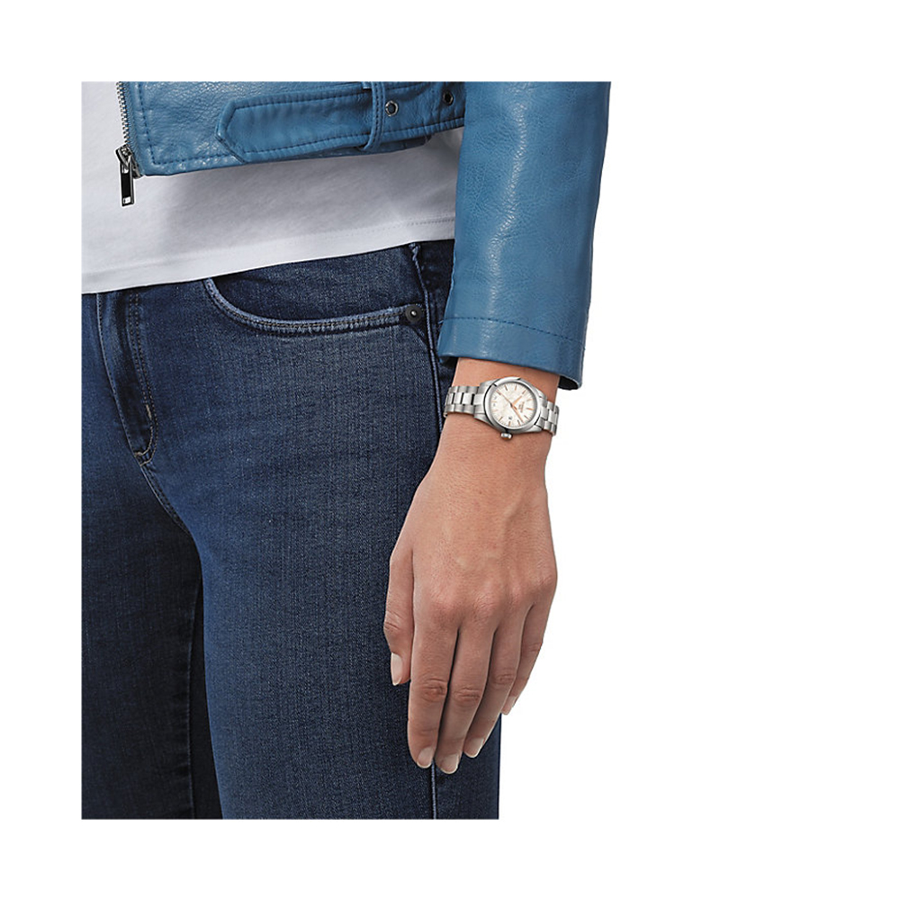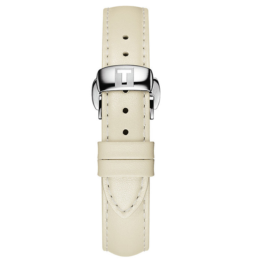 Diese Modelle der T-My Lady verfügen über ein widerstandsfähiges Edelstahlgehäuse mit einem Durchmesser von 29 mm, einem Swiss Made Quartzwerk, einem zusätzlichen Lederarmband zum einfachen Wechseln ohne Werkzeug und einer schlichten Eleganz dank einer zeitlosen Linienführung. Die T-My Lady von Tissot ist eine feminine Uhr, die aufgrund ihrer Konzeption und des Designs zur perfekten Wahl für alle Frauen wird, für die eine Uhr ein zeitloser Begleiter ist. Als feminines Pendant zur Produktreihe Tissot Gentleman verfügt die T-My Lady tatsächlich über alle Attribute der uhrmacherischen Qualität, welche die Zeitmesser von Tissot auszeichnen. Die Erfahrung und die Sorgfalt, mit der diese Produktlinie kreiert wurde, sind am Gehäuse und Armband aus Edelstahl, insbesondere aber an den Details ihrer besonderen Highlights erkennbar. Bei den Stundenzeigern handelt es sich um applizierte, abgeschrägte Zeiger in 3D-Optik. Auch das Datumsfenster ist als Relief ausgeführt und betont die Zifferblätter mit ihren schmeichelhaften und leuchtenden Veredelungen, die jederzeit eine perfekte Lesbarkeit gewährleisten. Ihre zurückhaltende Eleganz fügt sich in den beruflichen Alltag mit alle seinen Anforderungen ein und harmoniert mit unterschiedlichsten Bekleidungsstilen von der Jeans über den Hosenanzug bis hin zum kleinen Schwarzen. Diese Ausführung der T-My Lady besitzt ein perlmuttfarbenes Zifferblatt sowie ein 316L-Edelstahlarmband mit Faltschließe und Drückern. Das zusätzliche Lederarmband in Creme besitzt eine Faltschließe mit Drückern.