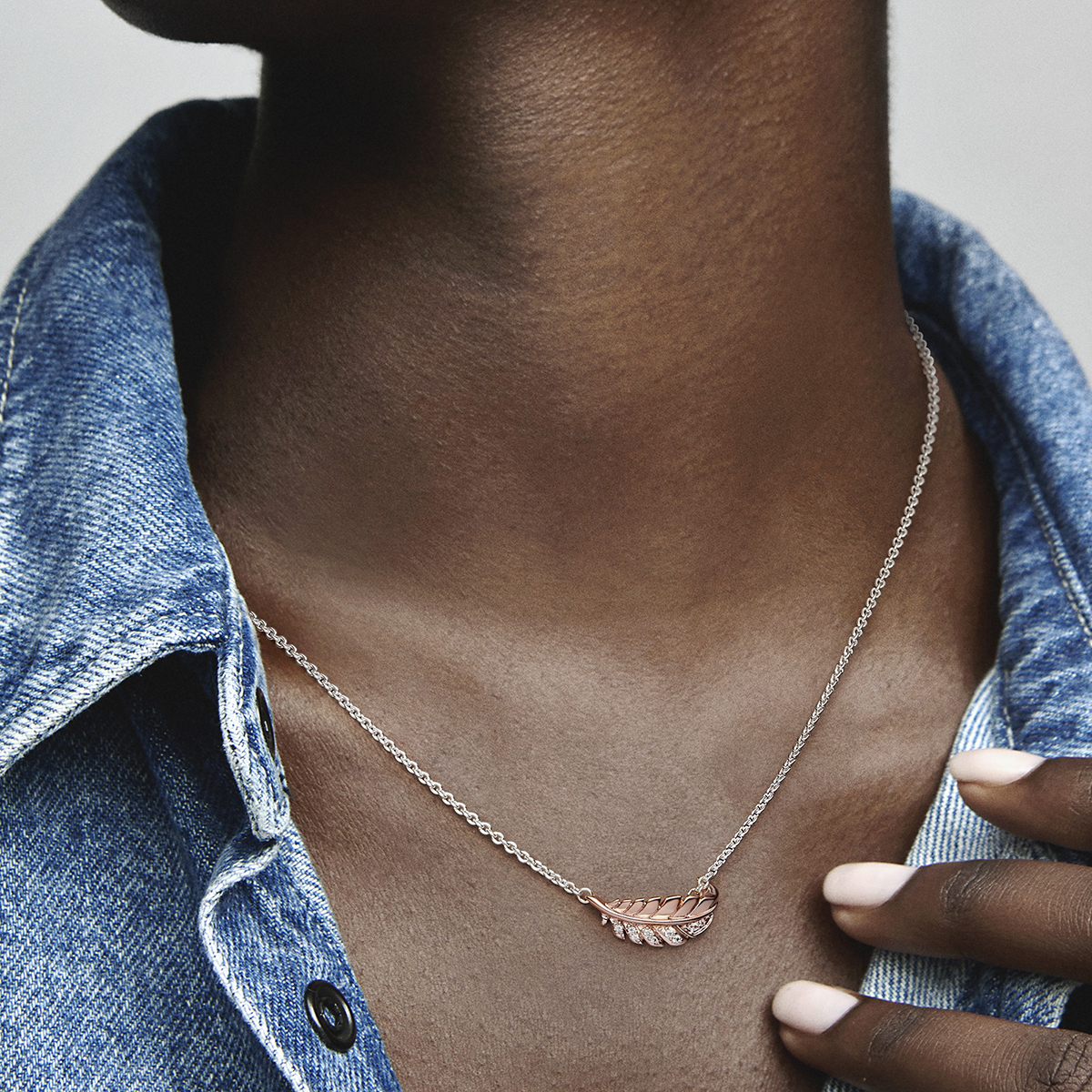 Fange das Licht der Saison ein mit unserer Zweifarbige schwebende geschwungene Feder Collier-Halskette. Diese Halskette trägt eine 14 Karat rosévergoldete Feder mit funkelnden Cubic Zirkonia auf der einen Hälfte und poliertem Metall auf der anderen. Die Spitze der Feder wölbt sich um den Biegering, mit der sie an der Kette aus Sterling-Silber befestigt ist und sie so aussehen lässt, als ob sie an deinem Hals schwebt. Das Ende der Kette ist mit einer runden Scheibe handveredelt, in die das Pandora Crown O eingraviert ist, und trägt drei Biegeringe für ein vielseitiges Styling. Trage diese verspielte Collier-Halskette mit anderen 14 Karat rosévergoldeten Schmuckstücken, um deinem Frühlingslook einen besonderen Glanz zu verleihen.
